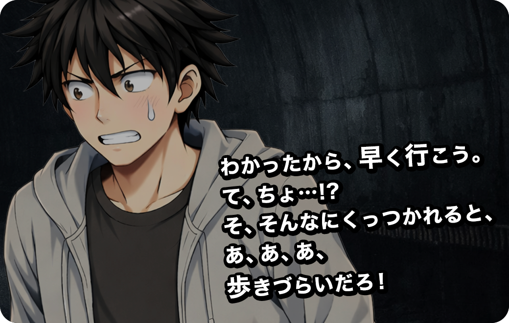 わかったから、早く行こう。て、ちょ…!? そ、そんなにくっつかれると、あ、あ、あ、歩きづらいだろ!